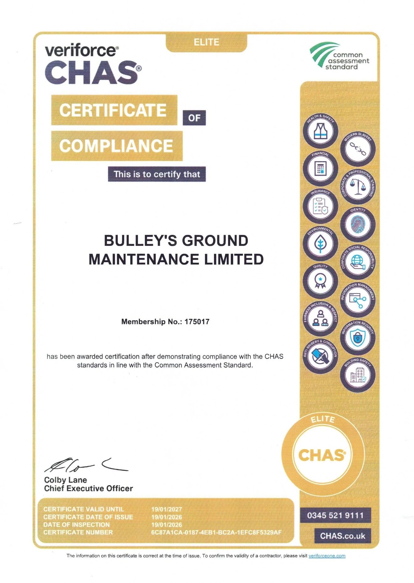 Bulley’s is a CHAS Elite accredited arboriculture and grounds maintenance contractor supporting Tier 1 and Tier 2 principal contractors, local authorities, housing associations and managing agents across Hampshire, Berkshire and the south of England